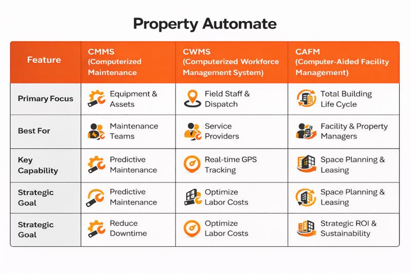 ويستخدم مقدمو الخدمات CWMS، بينما يعتمد مديروا المرافق والعقارات على CAFM كأداة استراتيجية للإشراف الشامل.